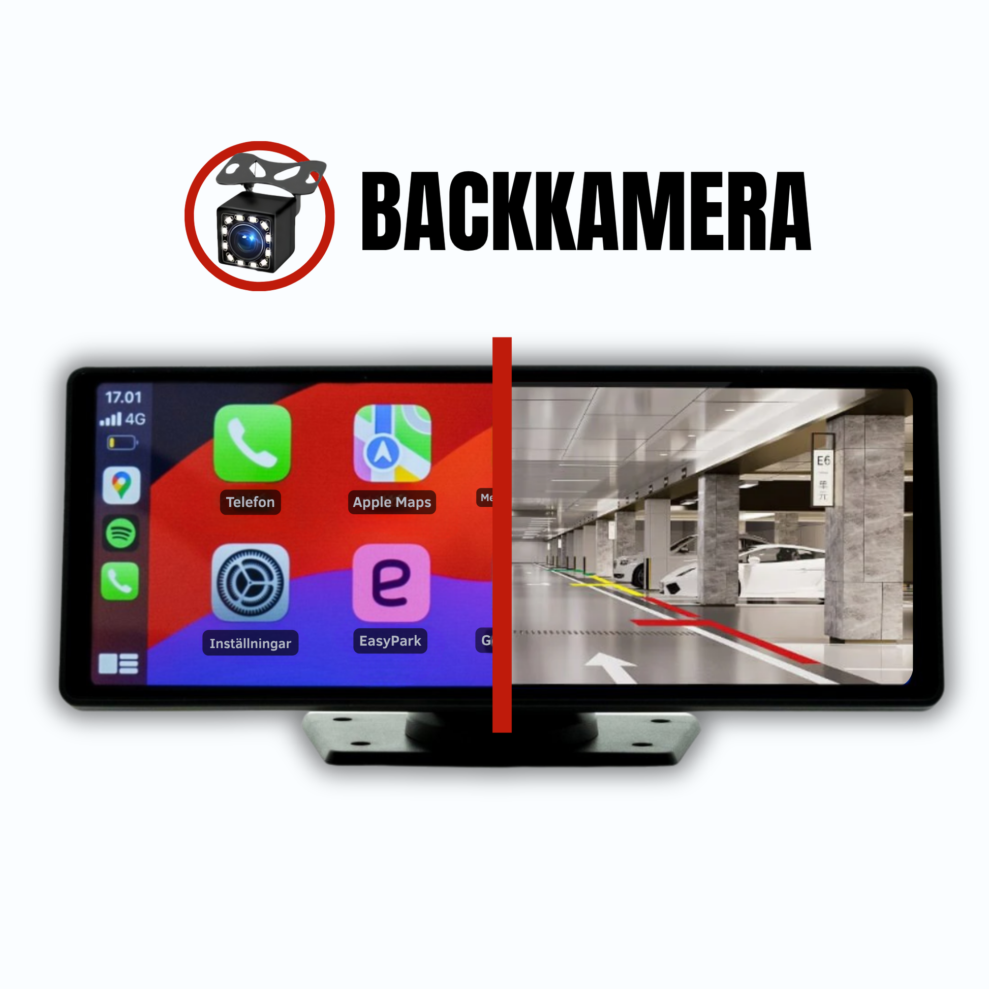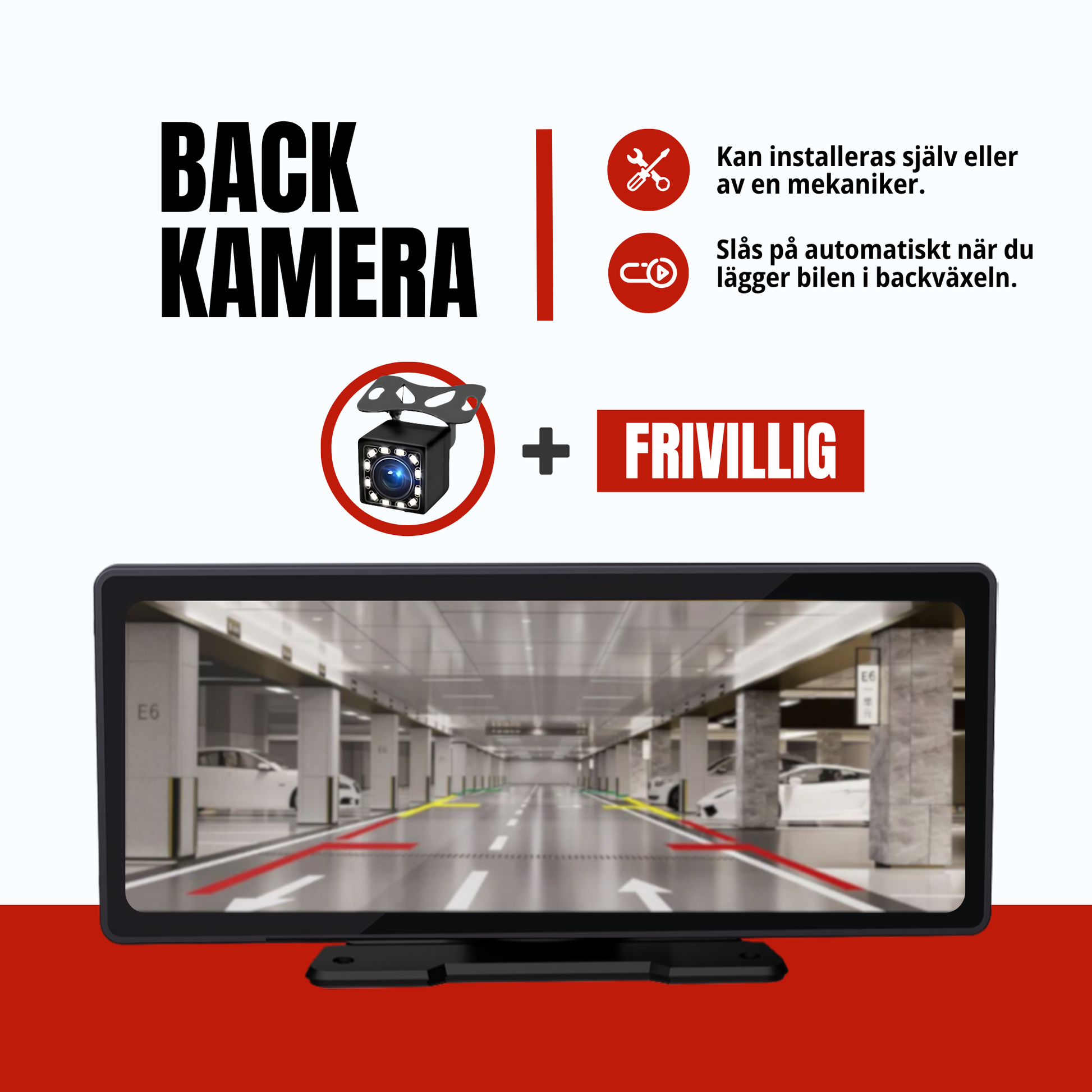 Vår backkamera är av högsta kvalitet och aktiveras automatiskt när du lägger i backväxeln. Detta kräver en kabelanslutning till bilens bakljus, vilket kan göras av en mekaniker eller någon som är händig.